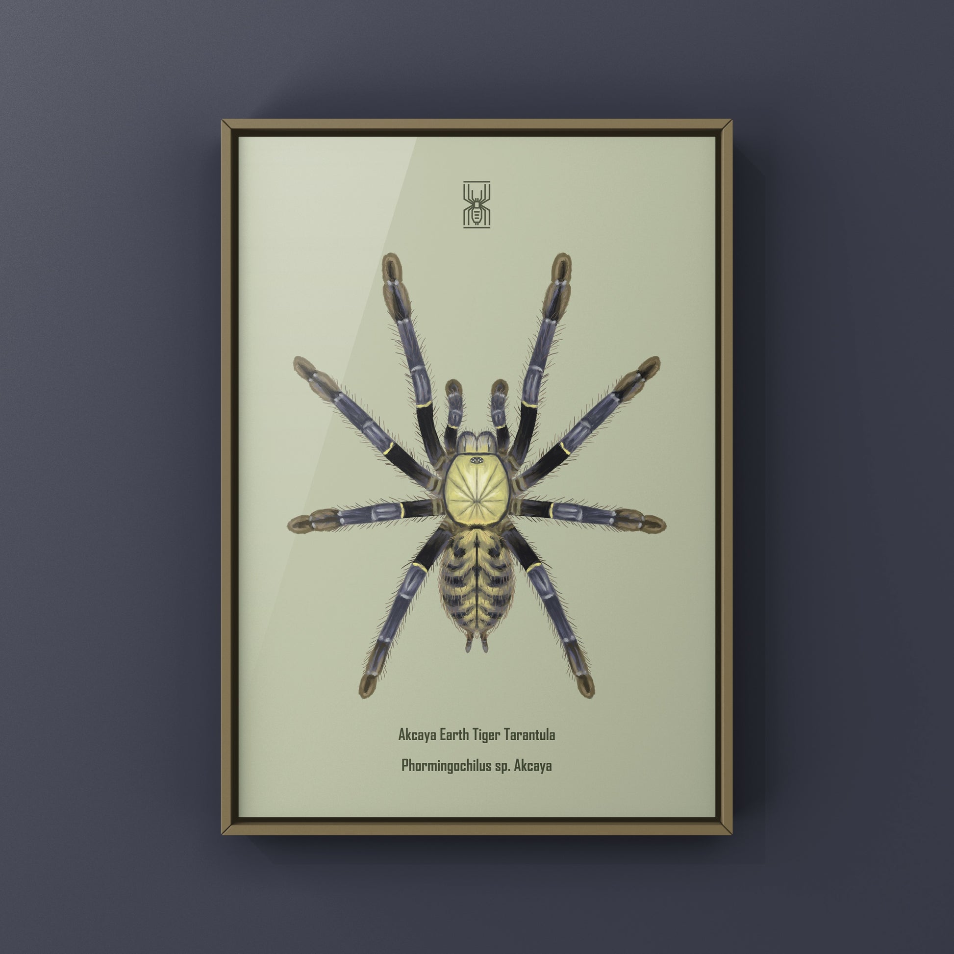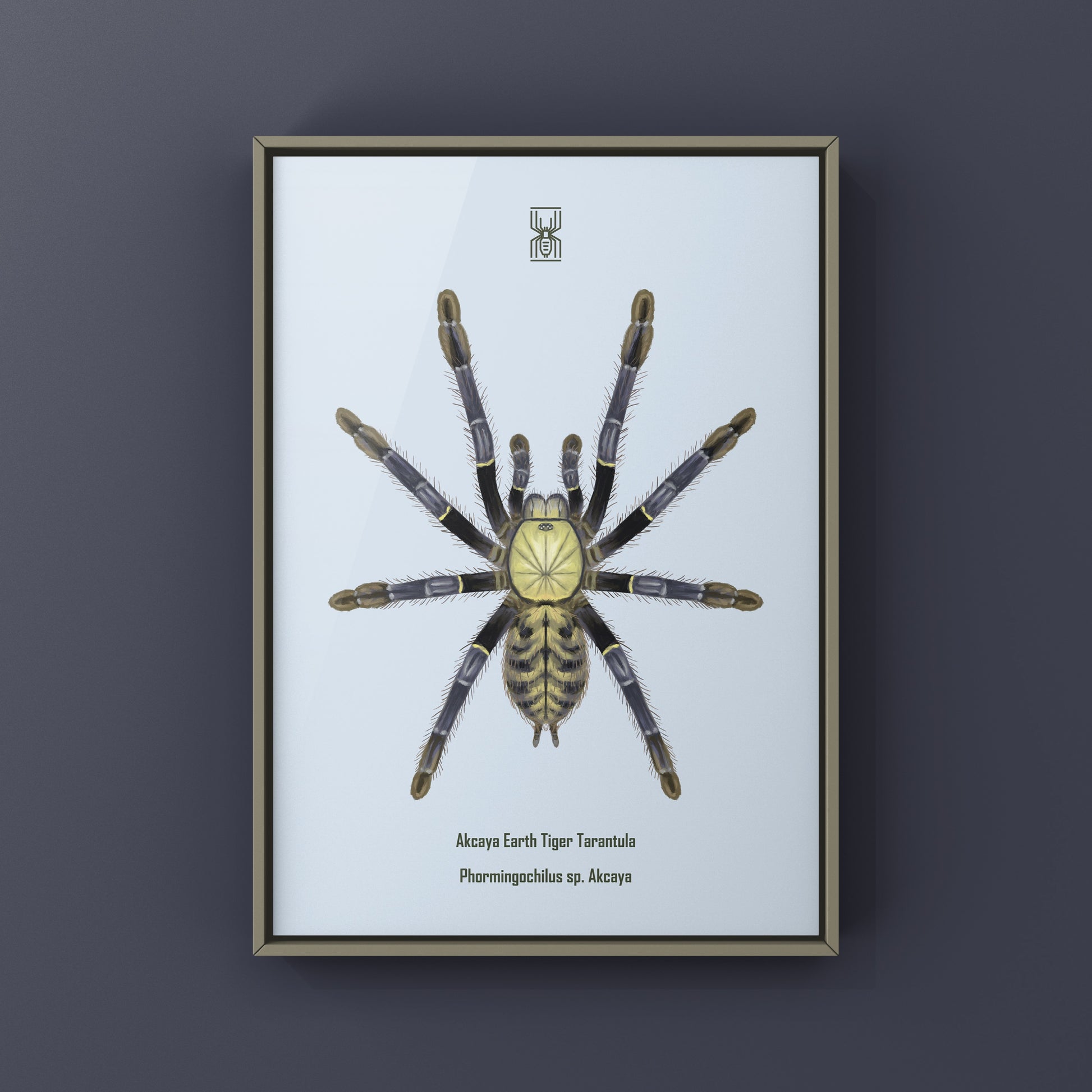 From The Silk Ranch, this Akcaya Earth Tiger Tarantula art print features Phormingochilus sp. Akcaya, a visually intense Old World species admired for its tiger-like striping and robust form. Created from original illustrations by Mingo X, this piece captures the raw presence and dramatic patterning of earth tiger tarantulas.