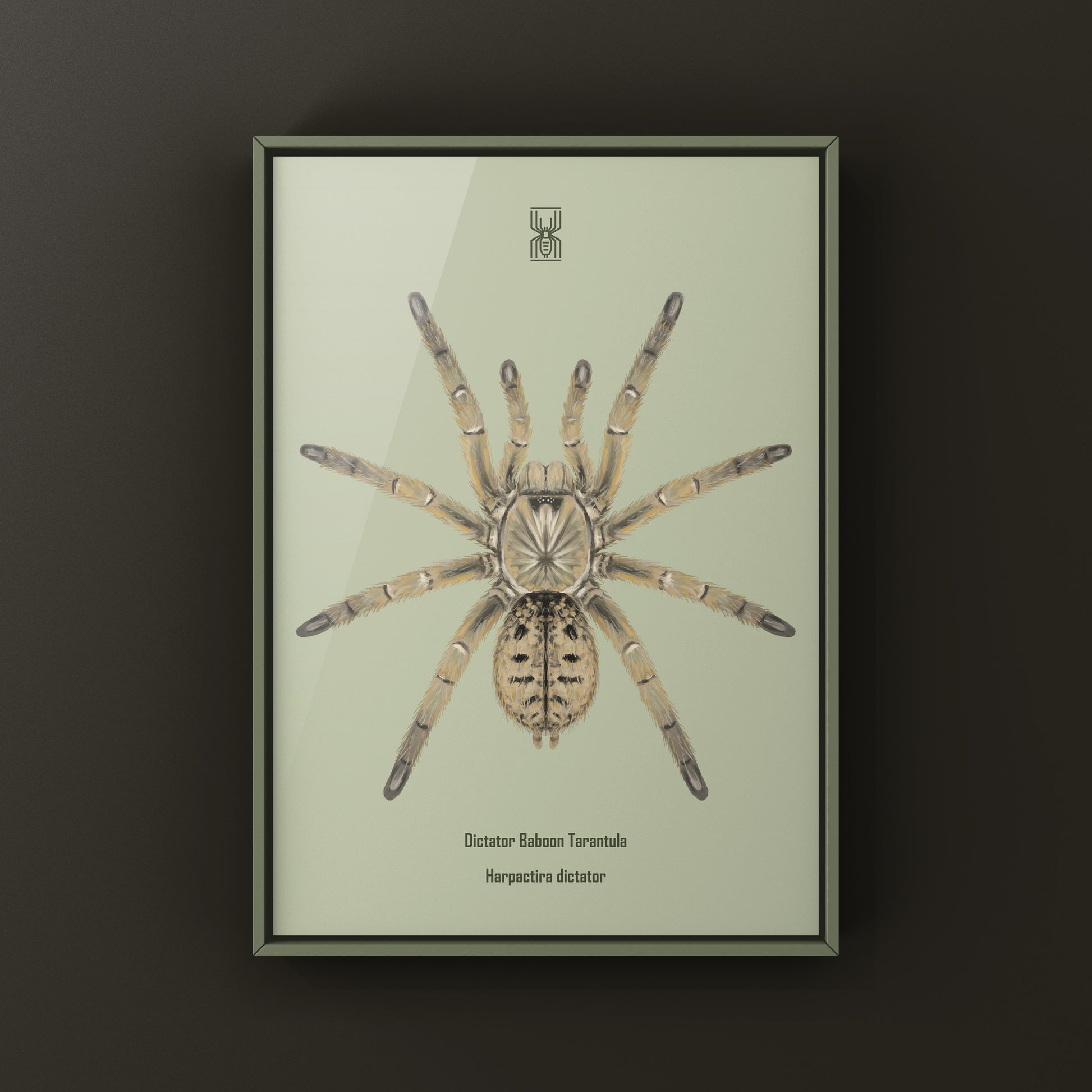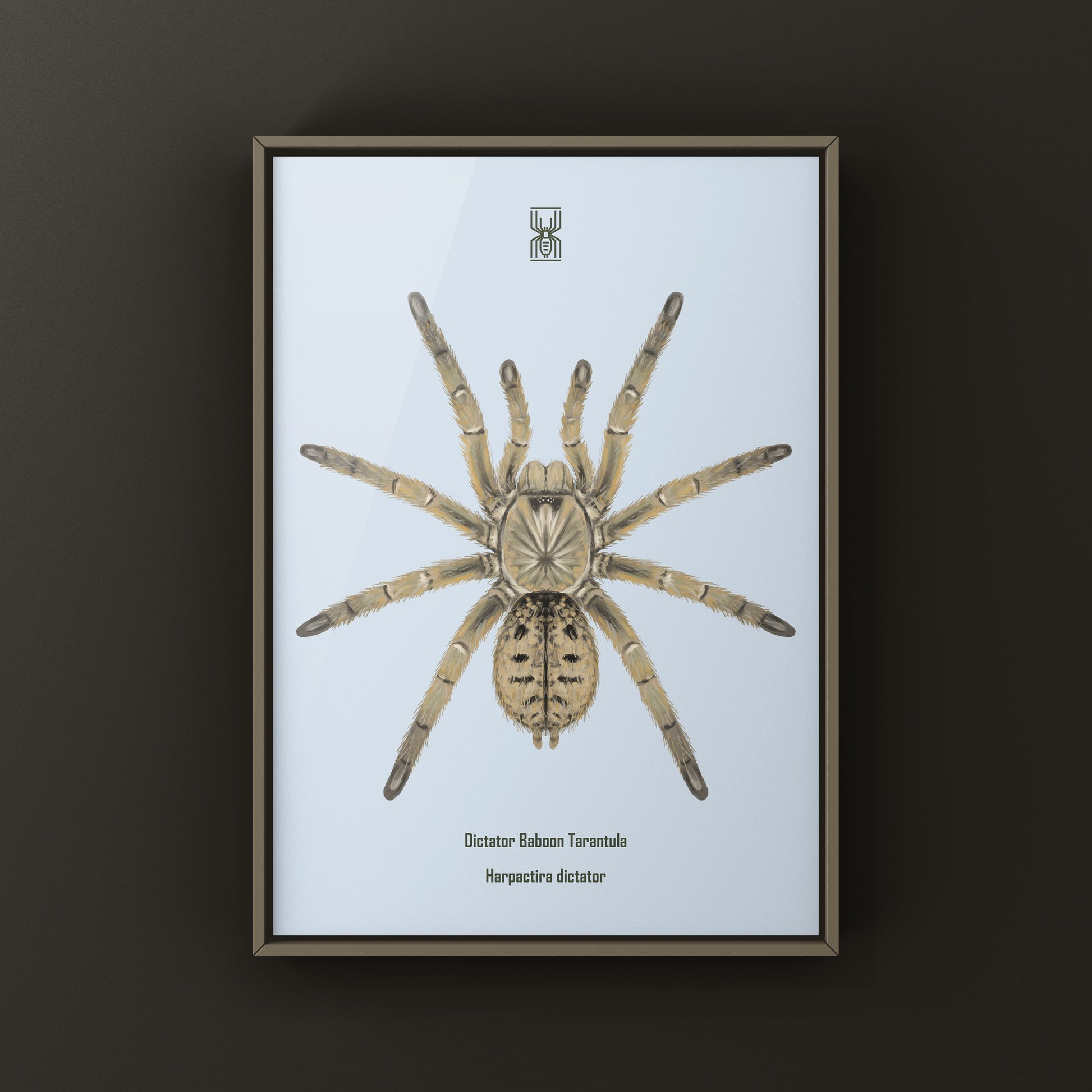 From The Silk Ranch, this Dictator Baboon Tarantula art print features Harpactira dictator, a formidable Old World species known for its strength, bold coloration, and commanding posture. Created from original illustrations by Mingo X, this piece captures the intensity and presence of African baboon tarantulas.