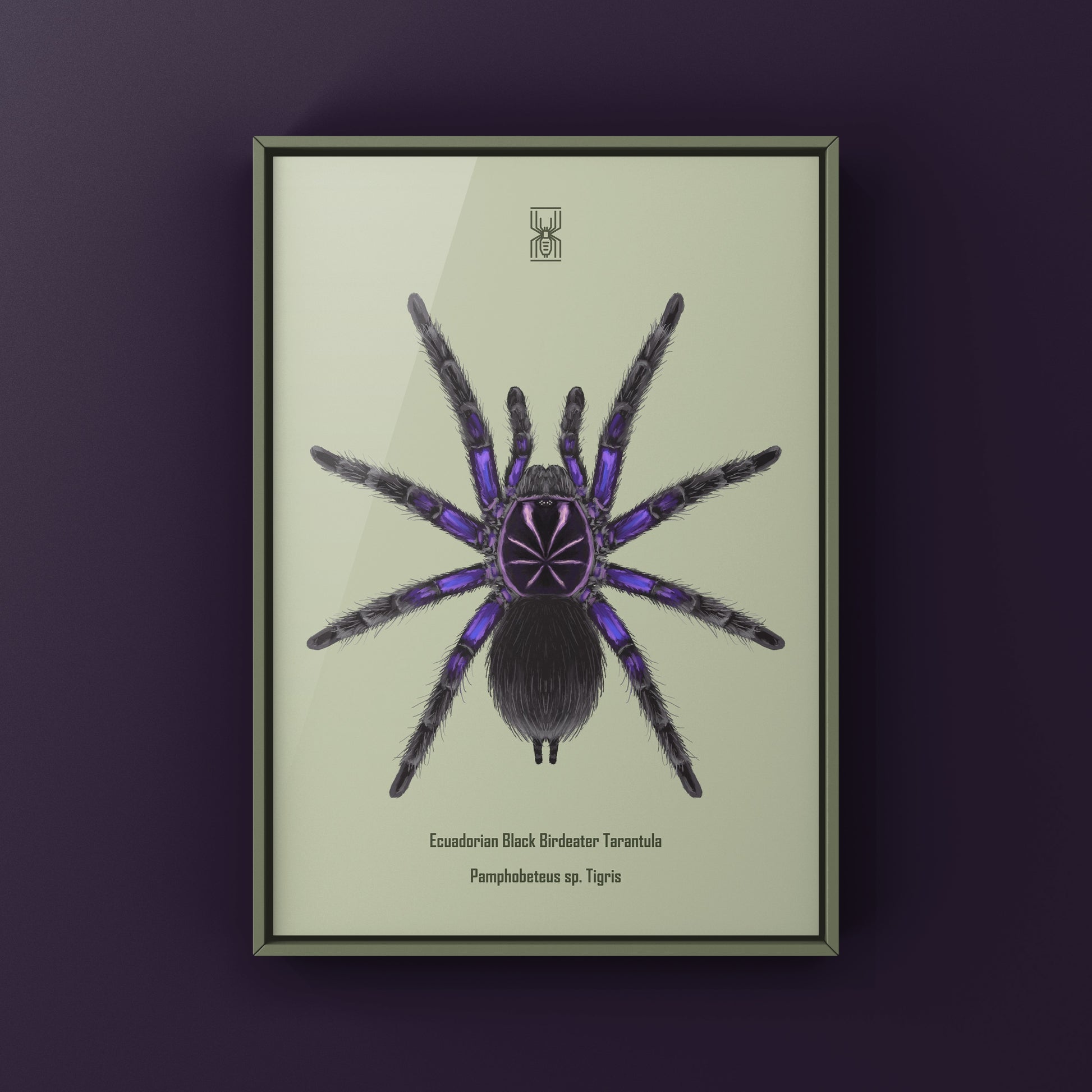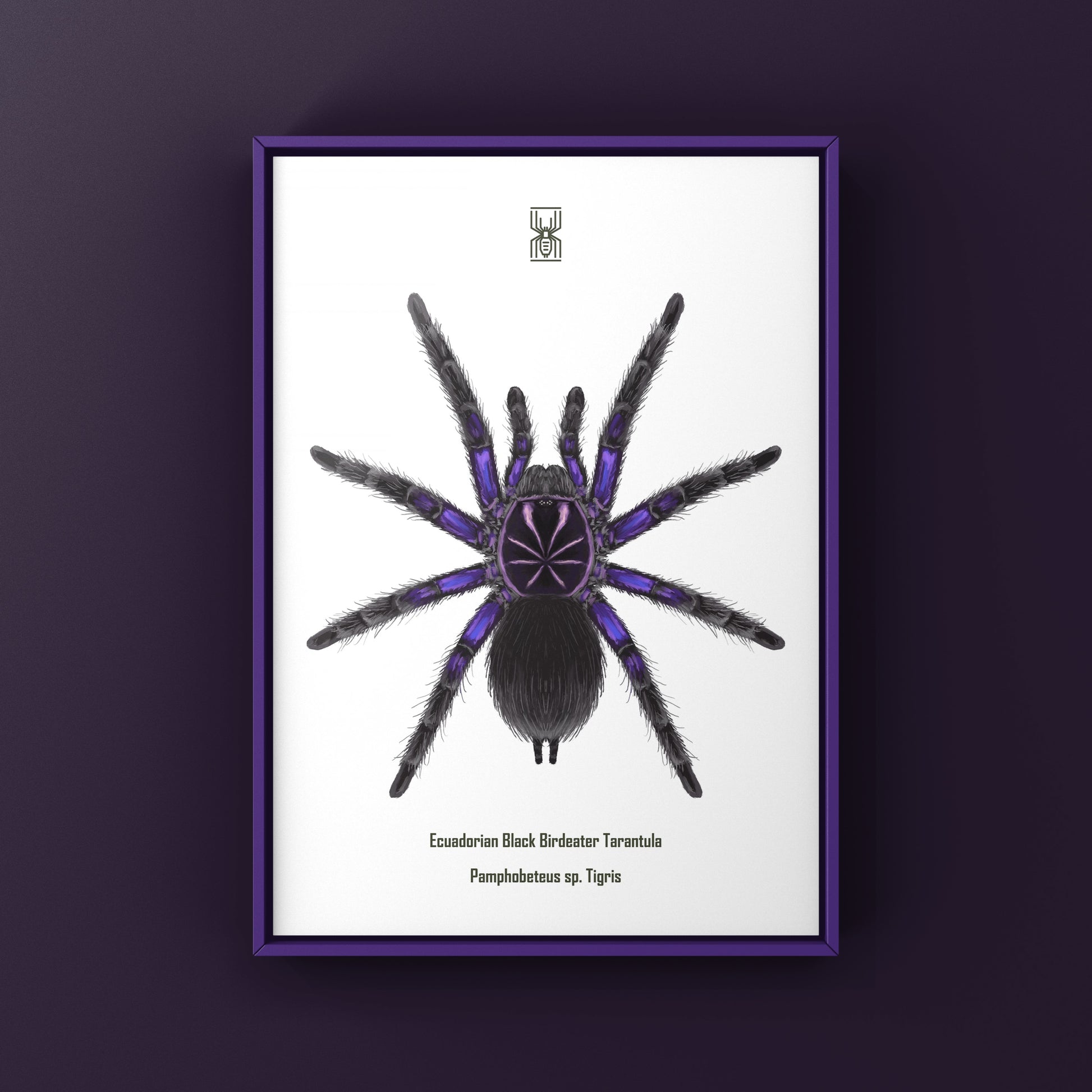 From The Silk Ranch, this Ecuadorian Black Birdeater Tarantula art print features Pamphobeteus sp. Tigris, a massive New World tarantula recognized for its dark coloration and imposing presence. Created from original illustrations by Mingo X, this piece emphasizes scale, strength, and tropical tarantula diversity.